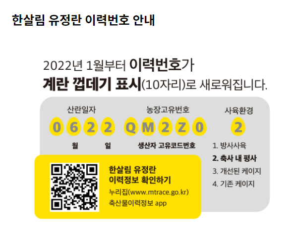 한살림 유정란 이력조회는 누리집, 축산물이력정보앱에서 확인할 수 있어요. 산란일자, 농장고유번호, 사육환경을 알 수 있는데요. 주부들이 대부분 마지막 숫자인 난각번호를 가장 많이 확인할 것 같아요. 저의 경우도 맨 마지막에 방사자유란인지, 축사가 평사형인지 그것만 보거든요. 그 동안 산란일자를 살피지 않았는데 기존에 이용하던 생협매장이 아니면 확인할 필요가 있겠어요.