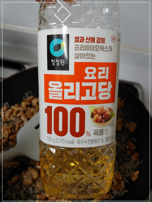반찬에는 주로 쌀조청을 사용하는데 이번에는 명절선물세트에 들어 있었던 청정원 올리고당을 사용했어요. 저는 바삭한 견과류 멸치볶음을 좋아하는데 아이는 학교급식에서처럼 약간 눅눅한 식감을 좋아하더라고요. 학교급식처럼 해달라는 요구를 해요. 비린내를 제거하기 위해 좀 오래 볶았을 때 바삭한 식감으로 변했을 때는 생수를 두 숟가락을 넣어 눅눅하게 후처리를 다시 해서 아이에게 맞춰줘요.
