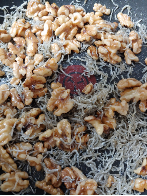 무쇠프라이팬을 사용하다가 무게에 조금 지쳐서 지금은 작은 롯지팬을 사용하고 있어요. 견과류 멸치볶음을 한꺼번에 많이 해야하기 때문에 28cm 테팔 후라이팬을 사용했어요. 이번에는 아이에게 호두를 좀 먹여 볼 요량으로 일부러 호두를 많이 넣었어요. 식감도 눅눅하게 만들어서 아이에게 간택을 받을 수 있도록 했는데 어떨지 모르겠어요. 견과류 멸치볶음에는 한살림 현미유에 재료를 볶다가 비린내를 날리면서 간은 따로 하지 않고 올리고당에 생수 두 숟가락을 첨가하면 쉽게 완성되지요.