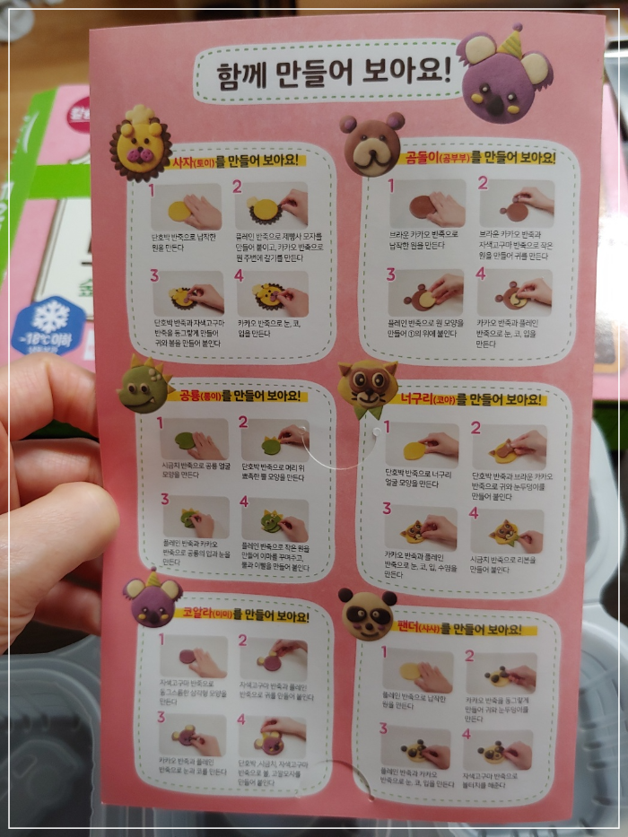 설명서에는 여섯가지 동물캐리터가 있는데요. 만들어 보니 반죽량은 저 동물들을 2개씩 만들 수 있는 양이었어요. 조금 남은 양으로 우리 아이는 엄마, 아빠 얼굴을 만들었고, 풀무원 토이쿠키 만들기에 포함되어 있는 비닐 포장지가 2개 있었는데 거기에 엄마, 아빠에게 각각 나누어 선물로 주더군요. 플라스틱 캐리턱용기와 설명서를 다음에 색깔반죽 만들어서 한번 더 활용하려고 냉장고 옆에다 부착해 두었어요.