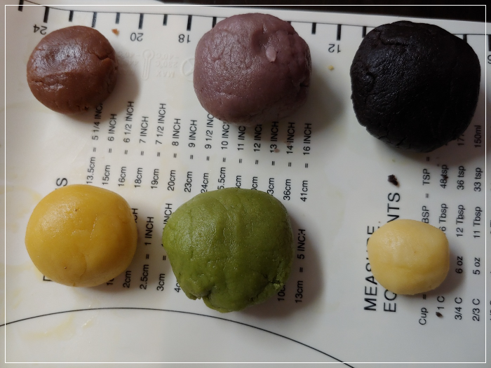 위의 사진처럼 풀무원 토이쿠키 만들기에는 총 6가지 색상의 쿠키 반죽이 들어있어요. 모두 자연재료로 색을 내었는데 플레인, 카카오, 브라운 카카오, 시금치, 단호박, 자색고구마로 색을 내었고 용량도 동일하게 되어 있지만 아이가 떼어 만드는 도중에 사진을 찍어 남은 반죽 크기가 다르게 보이는 거예요. 개인적으로 베이킹을 종종 하곤 하는데 냉동제품을 조물조물하면서 반죽이 금세 녹아 조금 질게 느껴지더라고요.