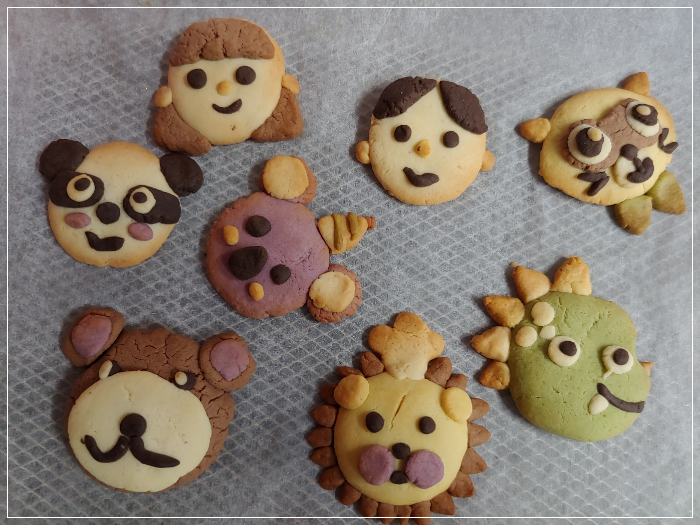 정말 귀엽게 잘 구워졌지요? 오븐에서 꺼낼때 제가 조심히 꺼내지 않고 팬을 흔들면서 쏟아붓다 보니 귀여운 사자갈퀴가 반이나 떨어져서 아이가 짜증을 많이 냈어요. 결국 망가진 사자는 제가 순삭 했어요. 풀무원 토이쿠키 만들기는 쿠키가 얇기 때문에 굽는 시간이 그리 오래 걸리지 않아요. 에어프라이어 140도에서 15분, 프라이팬에서는 약한 불 15~20분, 오븐 160~180도 예열 후 10~15분으로 나와 있는데 가정마다 오븐 사양이 다르니 꼭 지켜보고 있다가 설명서의 시간을 지키지 말고 구움색을 수시로 확인하면 앙증맞은 쿠키를 완성할 수 있을 거예요. 그리 어려워 보이진 않았어요. 한 30분 정도에 만들기는 완성했고, 굽는 건 엄마가 보초 서면서 구워내면 끝~.