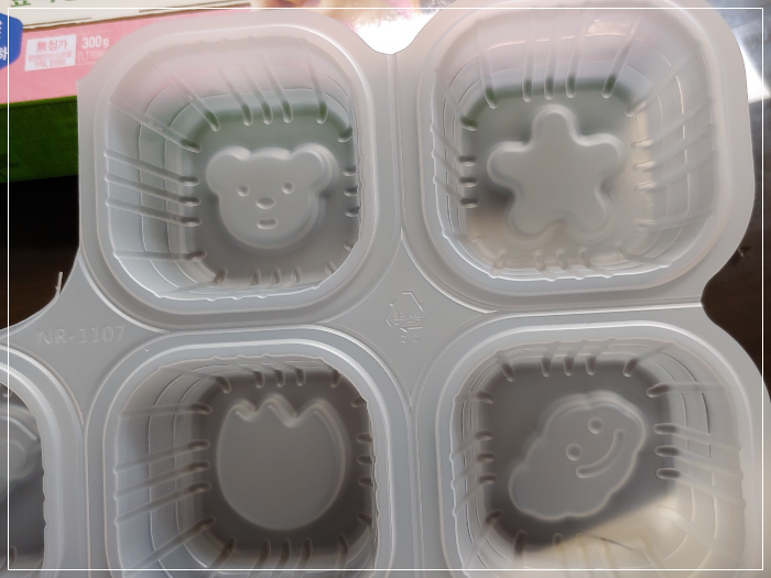 우리 아이는 조물조물 만들기를 잘 하는 편이고 고학년이라 설명서를 보고 잘 따라 할 수 있지만 그림을 보고 형태를 따라 하기 힘든 연령들에게는 위의 플라스틱을 활용해 찍기를 할 수 있도록 되어 있어요. 풀무원 토이쿠키 만들기에 들어 있는 용기에는 총 6가지가 있고요. 낱개를 잘라서 다음에 미니 도토리묵을 만들어 볼까 해서 용기를 씻어 보관해 두었어요. 대왕얼을을 만들 수도 있을 듯해서... 한 번 사용하고 분리수거 당하기에는 재질이 빳빳해서 어떤 용도로든 다음에 활용을 꼭 해보고 싶어요.