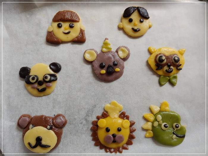 풀무원 토이쿠키 만들기를 해보니 가정용 오븐의 베이킹 팬에 두 판 나왔고요. 쿠키를 크게 만들면 한 개씩 만들 수 있을 반죽양이겠어요. 우리는 5~6cm 크기로 만들어서 캐릭터마다 2개씩 나왔고 엄마, 아빠 캐릭터까지 나왔어요. 어찌나 귀여운지요. 사진에서도 반죽이 조금 광이 나면서 질어 보이긴 하는데 회사에서 여러 실험 끝에 나온 농도이니 저 정도가 괜찮은 것 같아요.